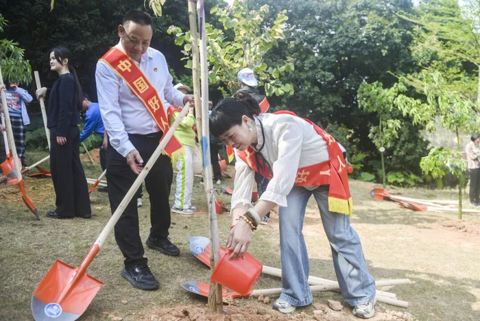 植树现场,“要领好东说念主”与嘉宾们劲头齐备,分组配合,挖坑、扶苗、培土、浇水整齐截齐。一株株宫粉紫荆、异木棉树苗在公共的尽心莳植下扎根滋长,为公园增添新绿。