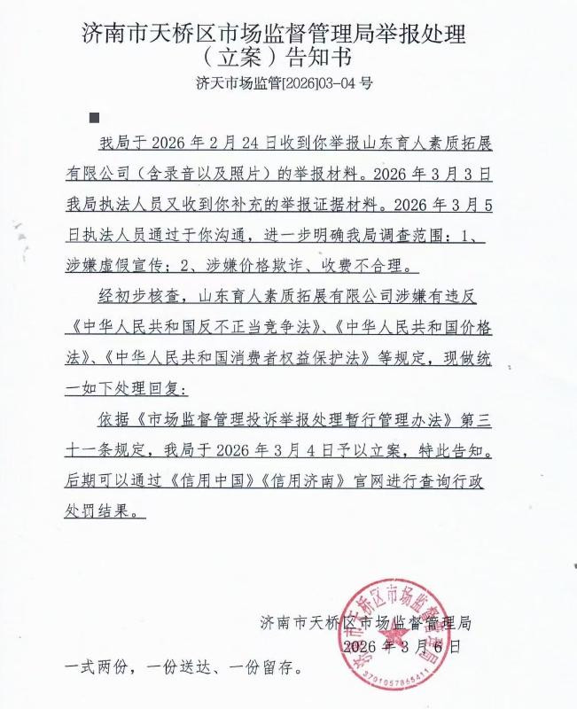 3月,张女士再行汇聚凭据并进行投诉,近日她见知记者,济南天桥区市集监督管制局已针对育东说念主心理疗愈中心诞妄宣传及价钱讹诈问题给以立案。据其提供的立案见知书泄漏,经初步核查,山东育东说念主教学拓展有限公司涉嫌有违犯《中华东说念主民共和国反不刚直竞争法》《中华东说念主民共和国价钱法》《中华东说念主民共和国消费者权益保护法》等治安。见知书泄漏济南天桥区市集监督管制局已于2026年3月4日给以立案。