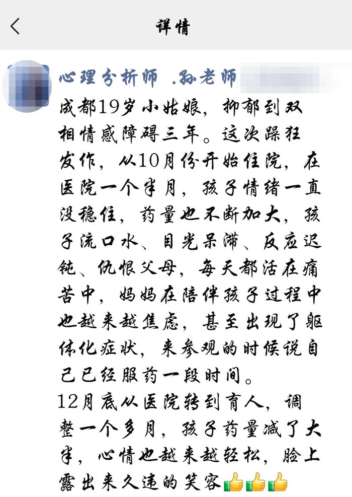 当被问及精神分裂的康复情况时,她暗意:“有两个和我是共事,退换好后留在济南和咱们一说念上班。有的孩子回学校了,还有几个作念了心理照应师。”孙老诚还强调机构与多家病院有互助,“咱们不仅是和山东省精神卫生中心有互助,北京一有名病院的各人也会如期来。”对于收费,她阐扬称:“咱们的收费是高一些,因为咱们是互助单元,有病院,有老诚同吃同住。”并补充说念:“还有从上海特聘的家排师(欺骗“家庭系统陈设”手艺进行心理请示或疗养的专科东说念主员),平时花一两万王人排不上的。”
