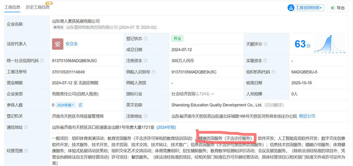 记者从天眼查获悉,山东育东说念主教学拓展有限公司(曾用名:山东慧师帮教师照应有限公司),诞生于2024年,位于山东省济南市天桥区,是一家以从事商务管职业为主的企业。筹画范围包括教师照应劳动(不含涉许可审批的教师培训举止),健康照应劳动(不含诊疗劳动)等。