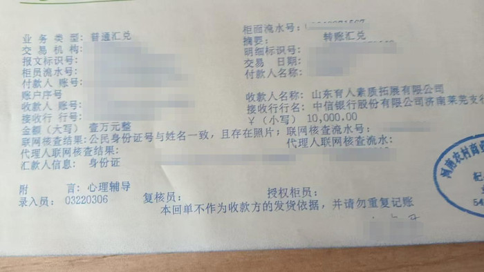 张女士暗意,其母亲通过视频号告白斟酌上育东说念主心理疗愈中心的邵主任。据其提供的聊天截图,张女士的母亲通过邵主任,向山东育东说念主教学拓展有限公司转账1万元,并备注了心理请示,“他们和我妈说,不错通过心理请示回反闲居生计,以后也能找到使命。机构里也有治好了去打工的,我妈就治服了,交了钱疗养3个月,说不让我管。我妈莫得跟我说一共交了些许钱,我看聊天记载泄漏有一个1万元的转账记载。”