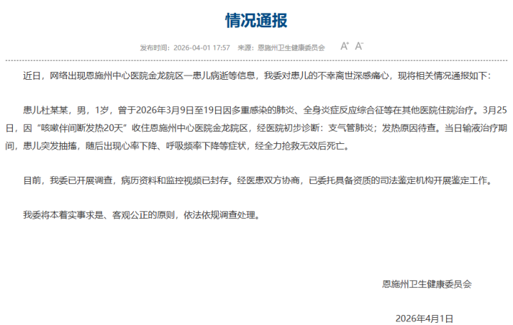通报线路,患儿杜某某,男,1岁,曾于2026年3月9日至19日因多重感染的肺炎、全身炎症响应详尽征等在其他病院入院调治。3月25日,因“咳嗽伴远隔发烧20天”收住恩施州中心病院金龙院区,经病院初步会诊:支气管肺炎;发烧原因待查。当日输液调治时辰,患儿突发抽搐,随后出现心率下跌、呼吸频率下跌等症状,经全力抢救无效后死一火。
