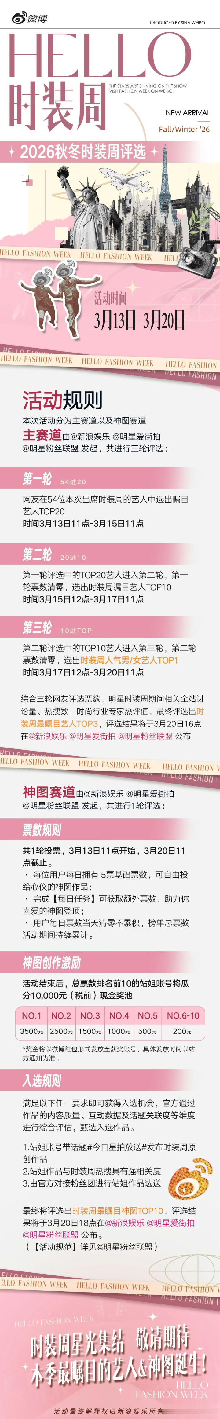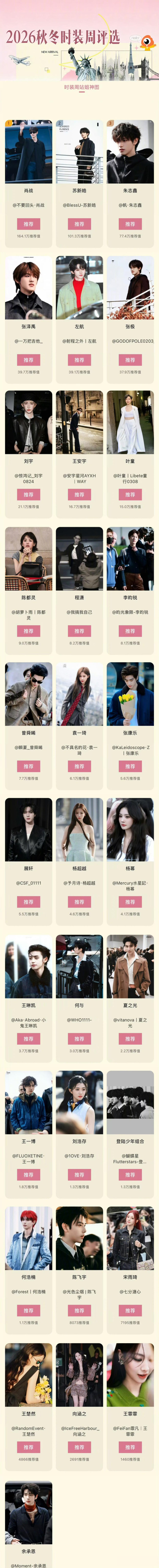 时装周能干艺东谈主TOP10名单靠谱的滚球app中国官网揭晓肖战杨紫刘宇暂居TOP前三。2026秋冬时装周能干艺东谈主TOP10名单已由新浪文娱平台于3月17日厚爱公布,终极对决正火热进行中,最终TOP3将于3月20日揭晓。