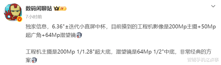 其中工程机主摄是200Mp 1/1.28"超大底,潜望镜则是64Mp 1/2"中底,博主用“绝顶经典的决议”来描述这套组合。