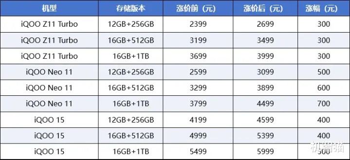 iQOO Z11 Turbo全版块涨300元,12GB+256GB版块从2399元涨至2699元;iQOO Neo11涨幅号称“离谱”,起步涨500元,1TB版块径直涨700元,卖到4499元;即就是4000元档的iQOO 15,也起步涨400元,16GB+1TB版涨500元。
