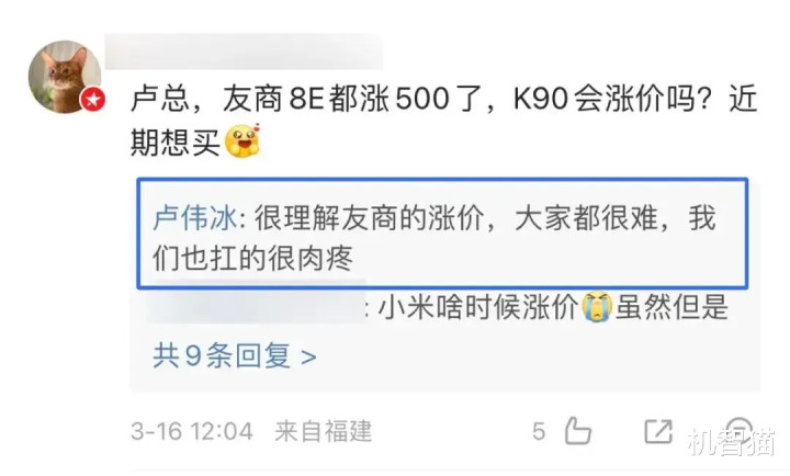 荣耀WIN RT、500轨范版、X70三款机型均上调300元,主打性价比的中端机型成了调价主力;而现在还在硬扛的小米,虽未对老款机型调价,但集团总裁卢伟冰直言“扛得特地肉疼”,备受期待的Redmi K90至尊版,订价概况率要高于上一代2599元的起售价,子品牌的涨价压力果决藏不住。