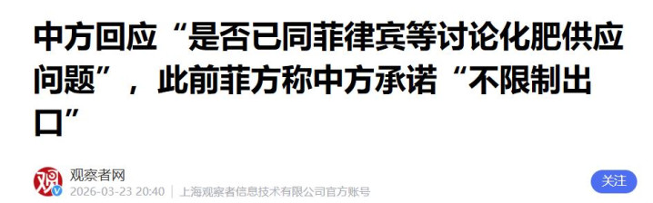3月17日,菲律宾农业部长劳雷尔蹙迫前去中国驻菲使馆,与大使井泉洽谈化肥供应,次日对外说明:中方应许不罢休对菲化肥出口,并开导“绿色通说念”加快通关。其时菲律宾寰宇化肥库存仅285万吨,最多撑到5月,春耕窗口在即,错过将导致水稻减产三成以上。