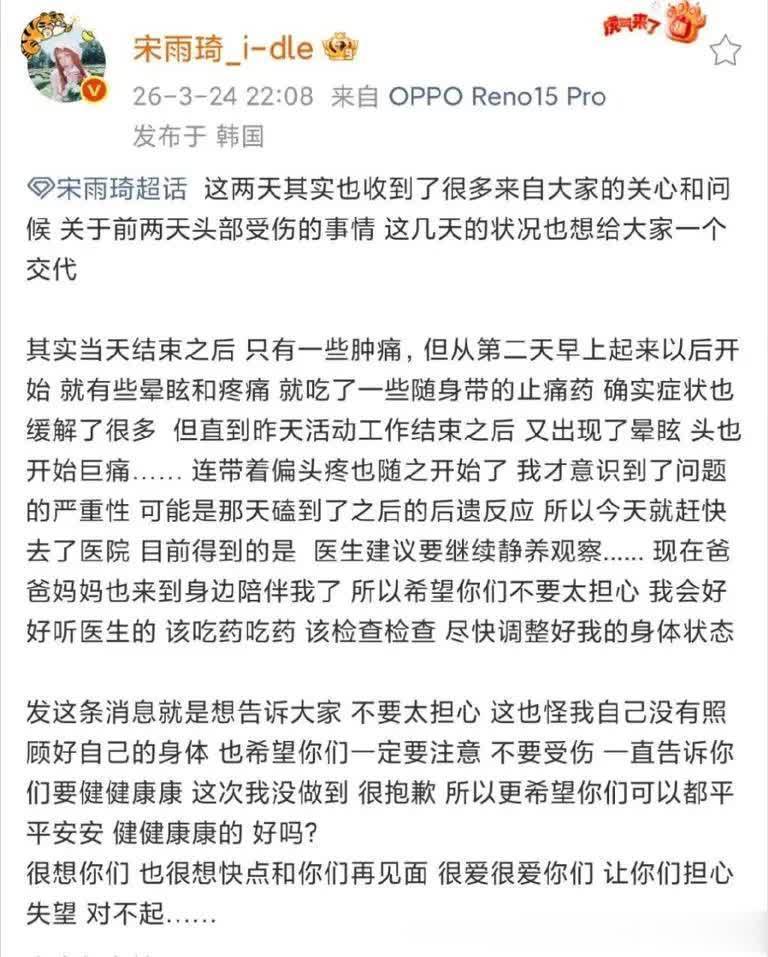 直到3月24日,宋雨琦才发文复兴伤情,坦言我方还是赶赴病院查验,大夫明确提议她立即暂停总共职责,放心静养,字里行间尽是傀怍:“一直告诉你们要健健康康,这次我没作念到,让你们记挂失望,抱歉”。据悉,当今宋雨琦正由父母伴随静养,暂未公开出面,而更让粉丝大怒的是,经纪公司CUBE文娱在她头部撞伤后,不仅未实时安排专科医疗介入,反而让她在24小时内转场湛江参与买卖直播,在高温中完成互动要领,最终导致伤情加剧,网友怒批“经纪公司拿艺东说念主健康换流量,太黩职”。
