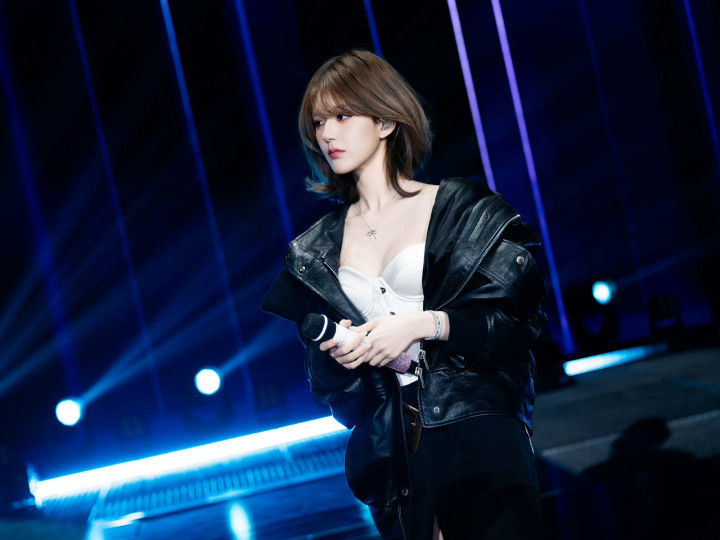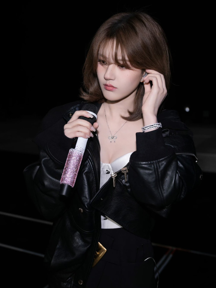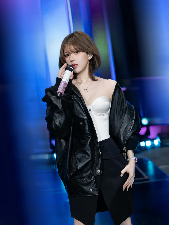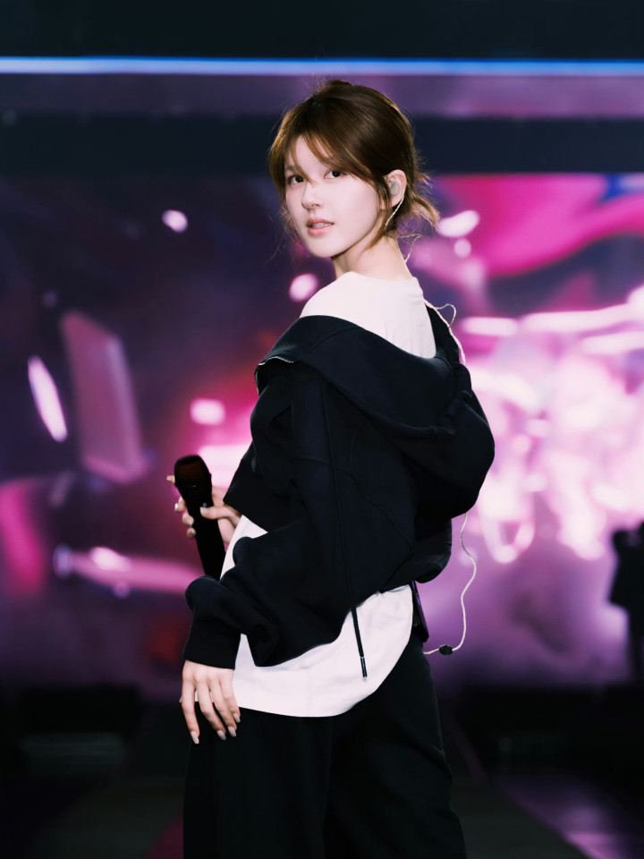 舞台上的她换回瑕瑜失业装,连帽卫衣叠搭白T,利落短发透着纰漏。持着麦克风的姿态安稳又水灵,眉眼间还是熟练的灵动甜意,却多了几分舞台上的笃信气场。