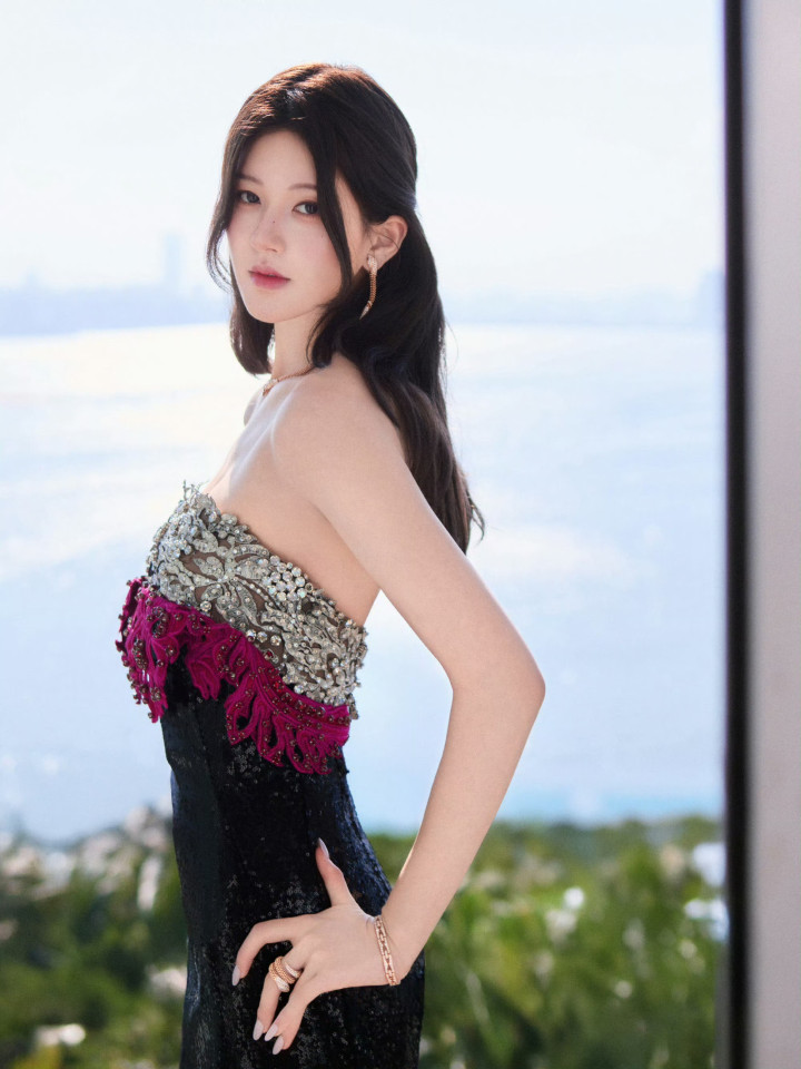 抹胸黑裙如夜色裹身,亮片在日光下泛着冷冽光芒,胸口玫红丝绒花饰与银钻刺绣撞色,滚球app中国官方网站迸发出浓烈视觉张力。长鬈发垂落肩头,从简珠宝点缀出风凉疏离感。