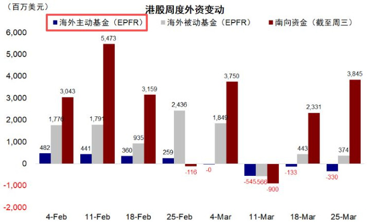 事实上,下图是港股周度外资变动情况。蓝柱代表外洋主动基金,灰柱代表外洋被迫基金。
