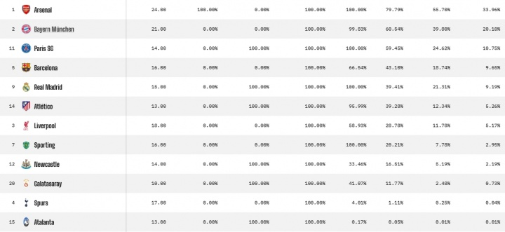 滚球app中国官方网站 OPTA更新欧冠夺冠概率: 阿森纳33.96%断档第1, 拜仁20.1%第2