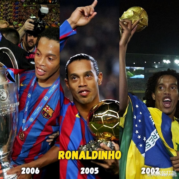 小罗(罗纳尔迪尼奥)2006年奴隶巴萨欧冠夺冠,2005年得回金球奖,2002年奴隶巴西寰球杯夺冠.