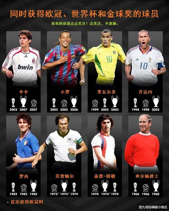 同期得回过欧冠、金球奖和寰球杯的9位据说巨星:卡卡、小罗、里瓦尔多、皆达内、罗西、贝肯鲍尔、盖德·穆勒。最近1个收尾此纪录的是阿根廷国度队队长梅西。