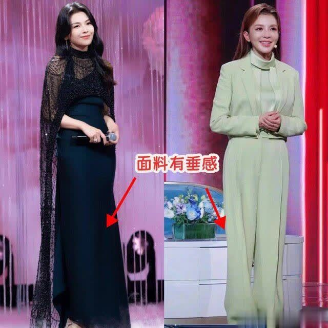 像朱迅以及刘涛就相比偏疼垂感好的真丝、混纺棉之类的材质,衣服的料子看着厚度适中,质感很好,不需要花里胡梢的讨论就可以展现出高档感。