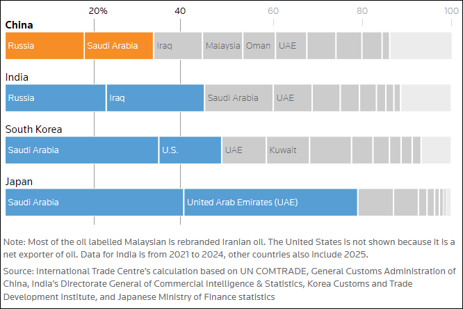 亚洲主要入口国原油入口量按起头地离别图。比拟于印日韩三国,在中国石油入口中,来自单一起头的石油占比不到20%。 路透社制图