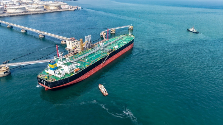 2026年3月31日,山东青岛,山东口岸青岛港原油船埠功课忙,一艘正在泊岸船埠的油轮。ICPhoto