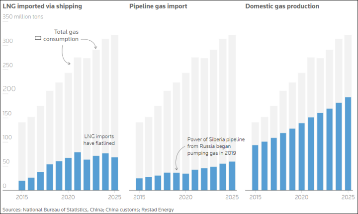 自2015年以来,中国的自然气起头相干于消费量的比例。 通过海运入口液化自然气量(左侧柱状图)相对安适,管说念自然气入口量(中间柱状图)逐年高潮,国内自然气坐褥量(右侧柱状图)也逐年高潮。 路透社制图