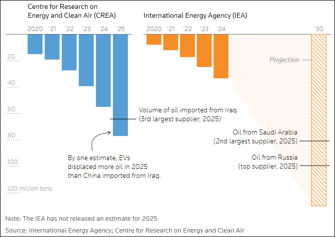 路透社称,数十年来,中国的经济增长一直由国际入口的化石燃料,尤其是原油所驱动。可是,跟着电动汽车产业的闹热兴起,中国正冉冉开脱对番邦石油的依赖,为其经济增长引擎注入了新的能源。
