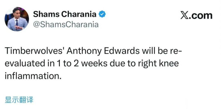 据名记shams报说念,爱德华兹因右膝炎症缺席将来1-2周的比赛。