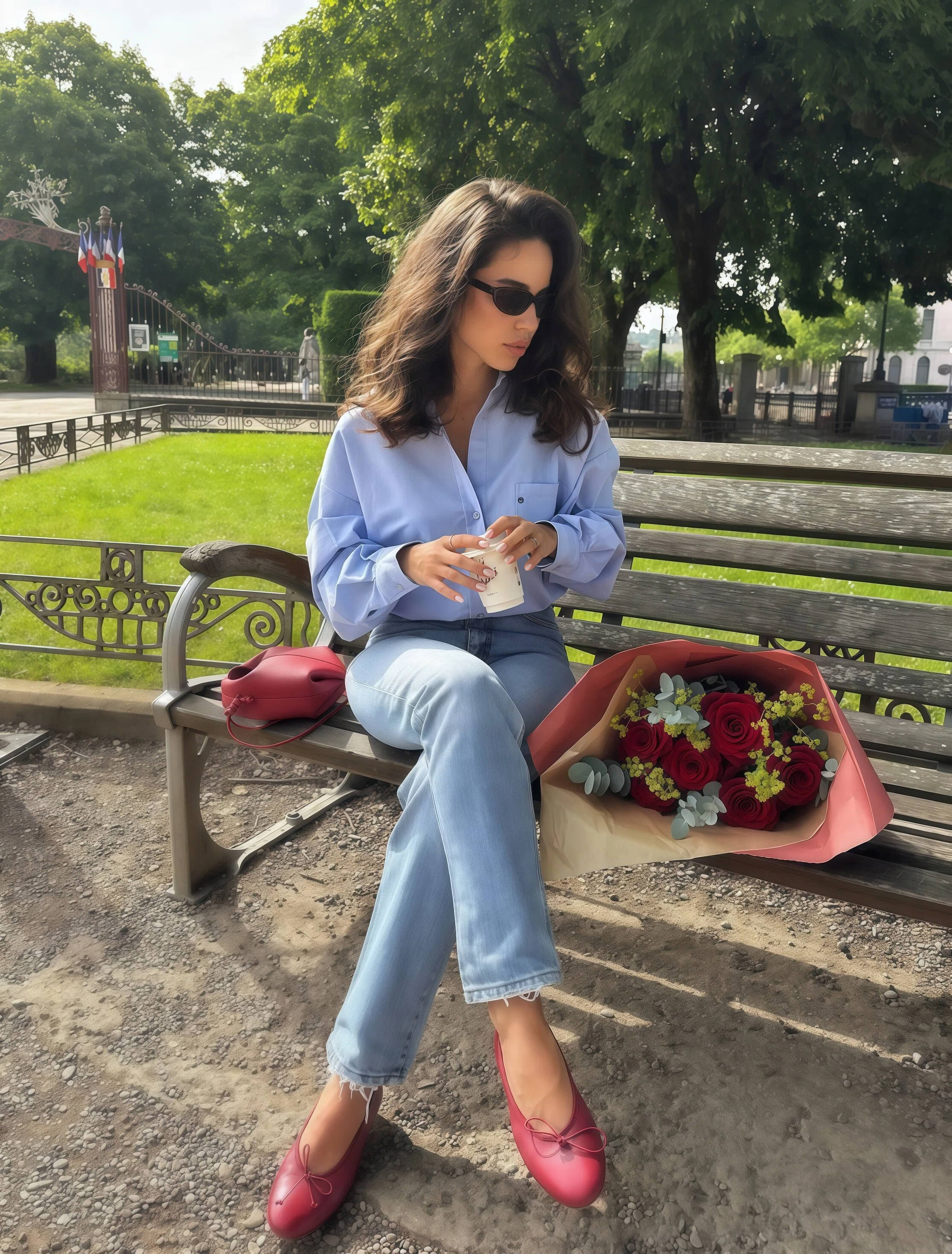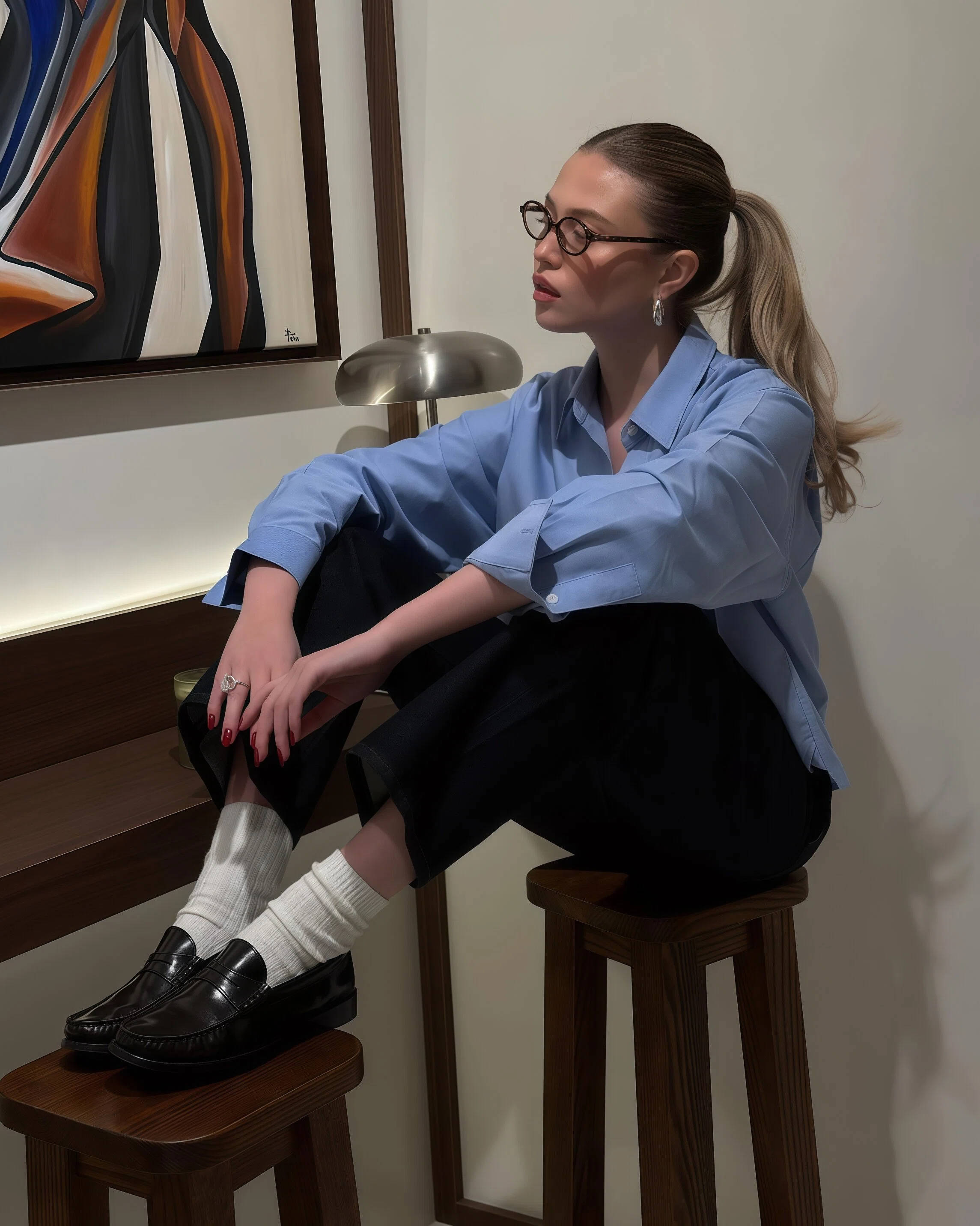蓝色衬衫配玄色九分裤最经典,平底鞋提议接收乐福鞋,这样能呼应衬衫的立场,让穿搭更齐全。