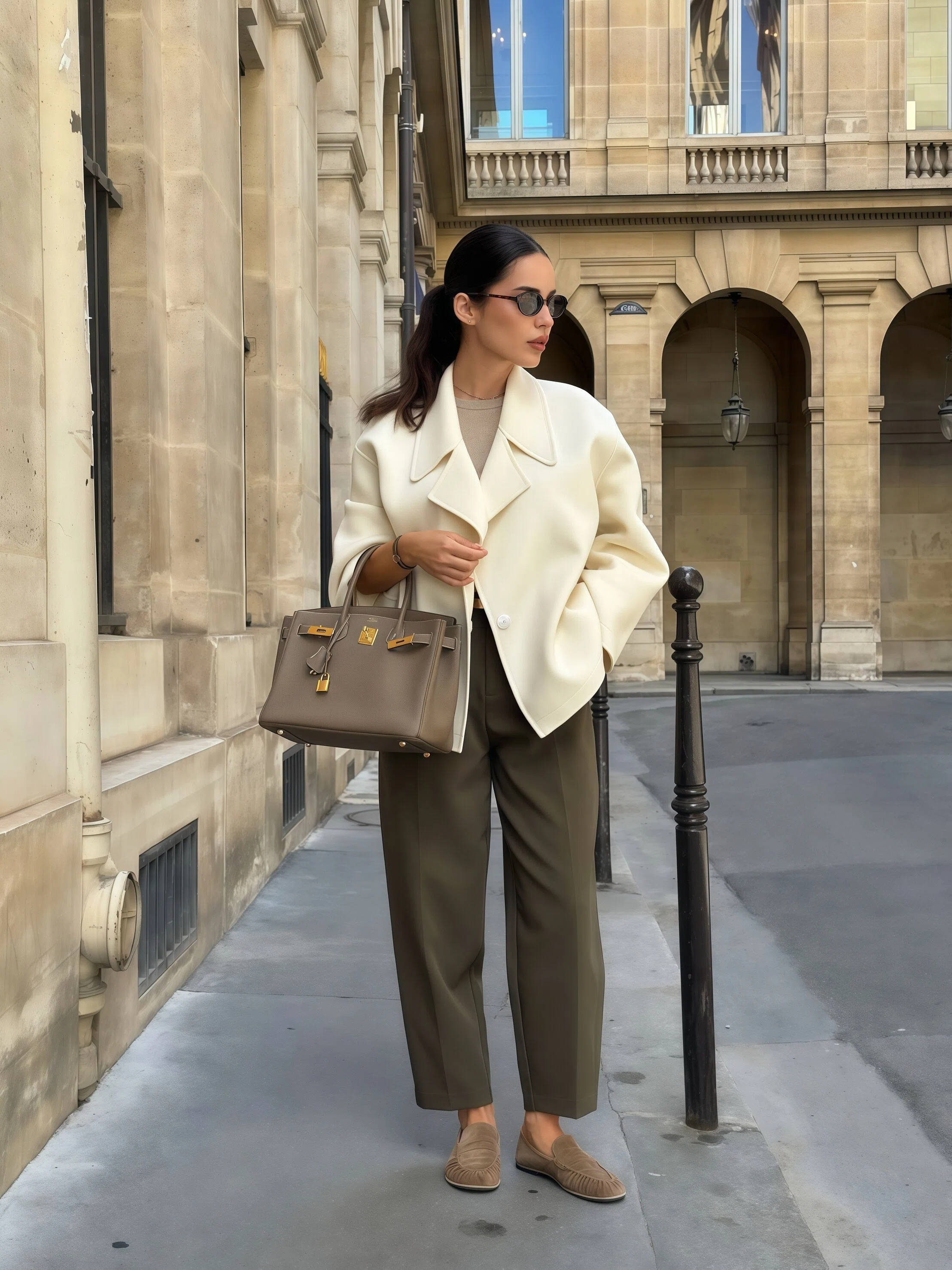 九分裤和平底鞋选同色系,能让腿部线条看起来相等通顺,玄色九分裤配玄色乐福鞋,米色九分裤配米色尖头鞋,颜料之间莫得较着的断层,腿部线条从裤腰一直蔓延到脚尖,这种搭配对小个子相等友好。
