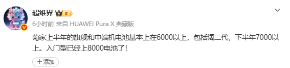 [CNMO科技音书]3月17日,数码博主“超维界”爆料称,华为上半年旗舰及中端新机的电板容量基本齐在6000mAh以上,其中包括折叠屏新品华为PuraX2;下半年新机将教唆至7000mAh以上,初学机型则已上探8000mAh。