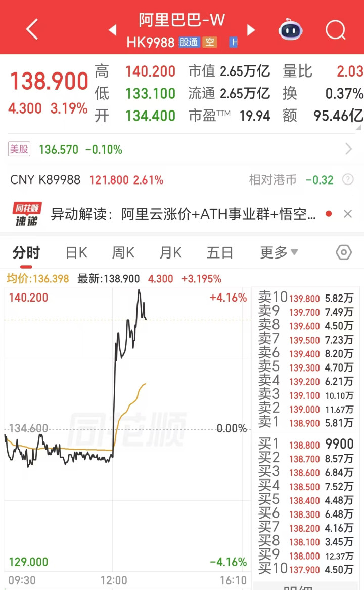 或是受阿里云上述居品加价等身分影响,阿里巴巴(09988.HK)股价午后拉升,涨幅一度进步4%。收尾界面新闻记者发稿前,其股价涨幅为3.19%,报138.90港元/股,AG庄闲游戏官网首页市值为2.65万亿港元。