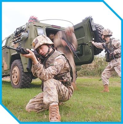 南部战区陆军某旅“尊干爱兵尺度连”官兵乘坐战车巡逻途中,穿插开展救急处突演练。