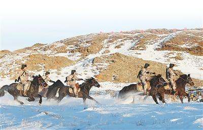 新疆军区某部乌拉斯台边防连官兵乘马巡边。