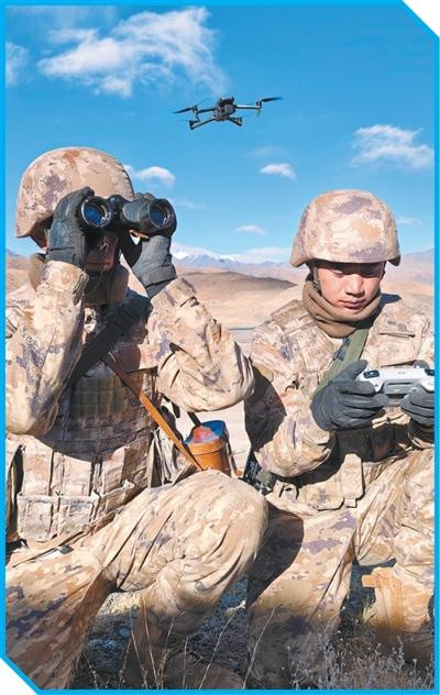 西藏军区某部昆木加哨所官兵正在主管无东说念主机开展巡逻。